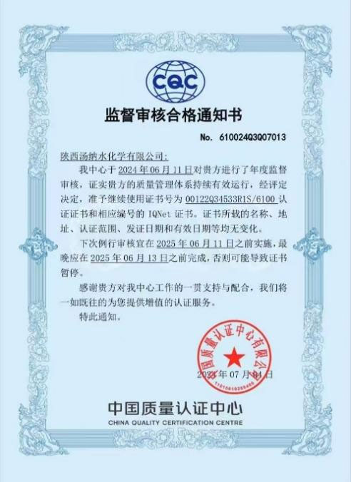 质量不仅是衡量企业竞争力的标尺,更是我们赢得市场信任、实现可持续发展的基石。近年来汤纳水化学有限公司在质量管理体系的指导下不断优化、完善各项日常管理工作,从而极大的促进了公司管理水平的持续提升。